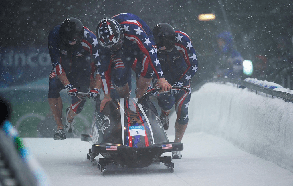 In this event, teams race down an icy track in a sleek metal sled, working together to steer and brake.