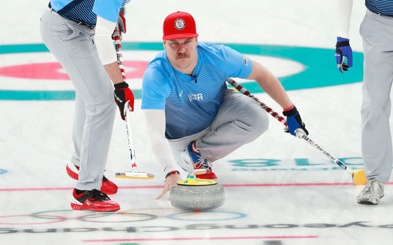 This event has teams sweeping the ice in front of the stone, or rock, to help it slide into a target.