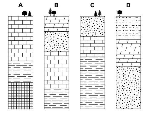 Columns A, B, C, and D below represent outcrops, of the same sequence of bedrock layers, found within 20 miles of each other. The rock layers have not been overturned.