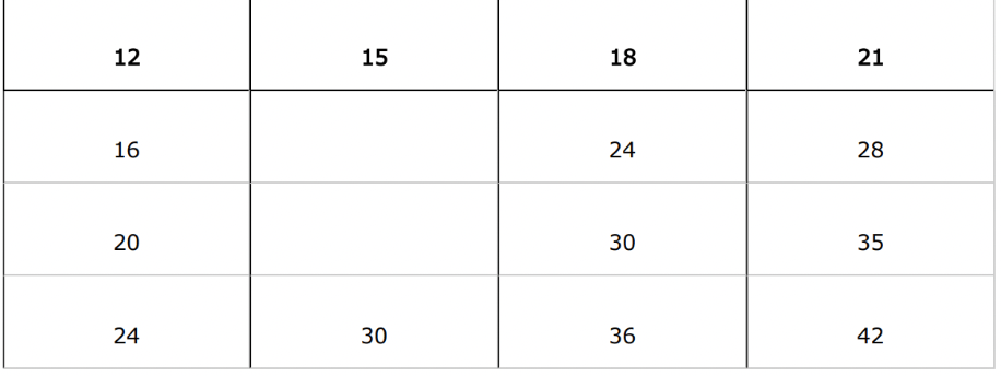 Aquí se muestra parte de una tabla de multiplicar. ¿Cuáles dos números completan correctamente el patrón en la tabla? ¿Cuál es el patrón?