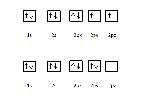 El oxígeno tiene como número atómico z= 8.¿Cuál de las siguientes distribuciones electrónicas en sus orbitales,indicados mediante cajas, es la correcta y por qué?