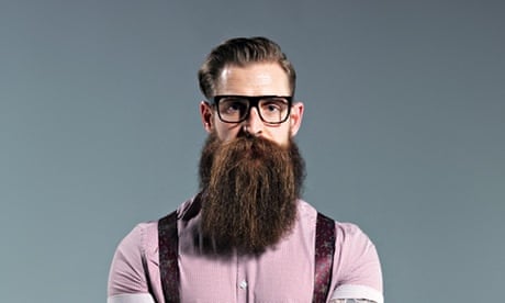 El hombre tiene barba grande y el pelo moreno. Tambien, tiene gafas.