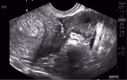 A 27-year old female presents to the Emergency Department with severe abdominal pain for the previous two days. Her urine pregnancy test at triage is positive. Vital signs on presentation are: blood pressure 85/60, heart rate 115 bpm, and respiratory rate 16. She is afebrile. Physical exam is significant for abdominal pain with guarding but no rebound. Pelvic exam is unremarkable. Bedside ultrasound is shown below. Which of the following is the most appropriate next step in management?