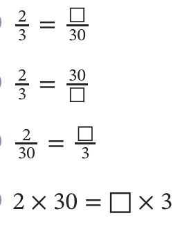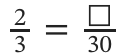 In Cara's homeroom, 2 out of 3 students ride the bus to school. There are 30 students in her homeroom. Which of the following shows how equivalent fractions could be used to find the number of students that ride the bus?