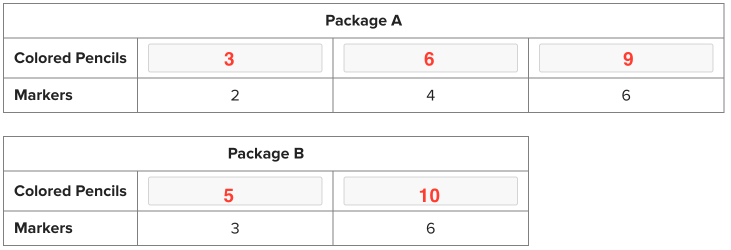 An art supplies store sells different packages that contain colored pencils and markers. Package A has a colored pencil to marker ratio of 3 to 2, and Package B has a colored pencil to marker ratio of 5 to 3. Complete the ratio tables for each package.