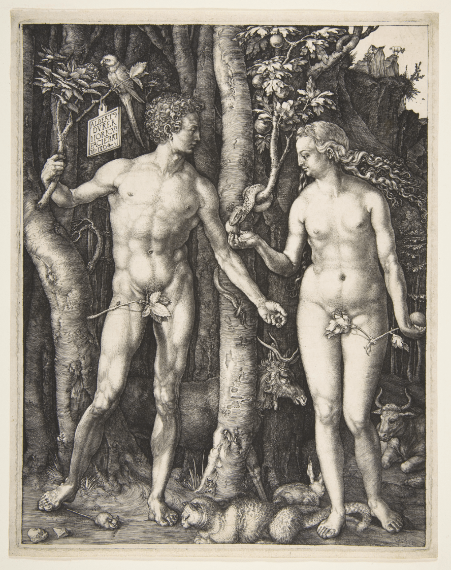 What are two visual clues that Durer's Adam and Eve isn't an attempt to tell the actual story?