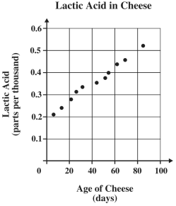 The scatterplot below shows the time cheese has been aging and the amount of lactic acid present in the cheese.