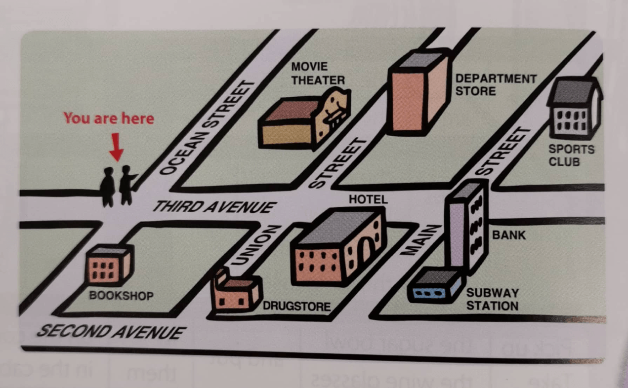 It's next to the bank. It's across from the hotel. It's on the corner of Main and Second avenue.