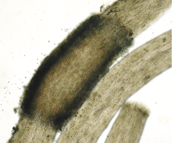 On pathology, this entity presents with round, pigmented “Medlar bodies” or sclerotic bodies resembling “copper pennies”