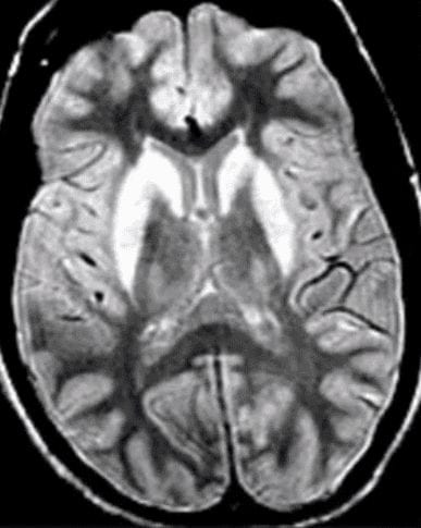 E. Iron deposition in the globus pallidus with an “eye of the tiger” sign