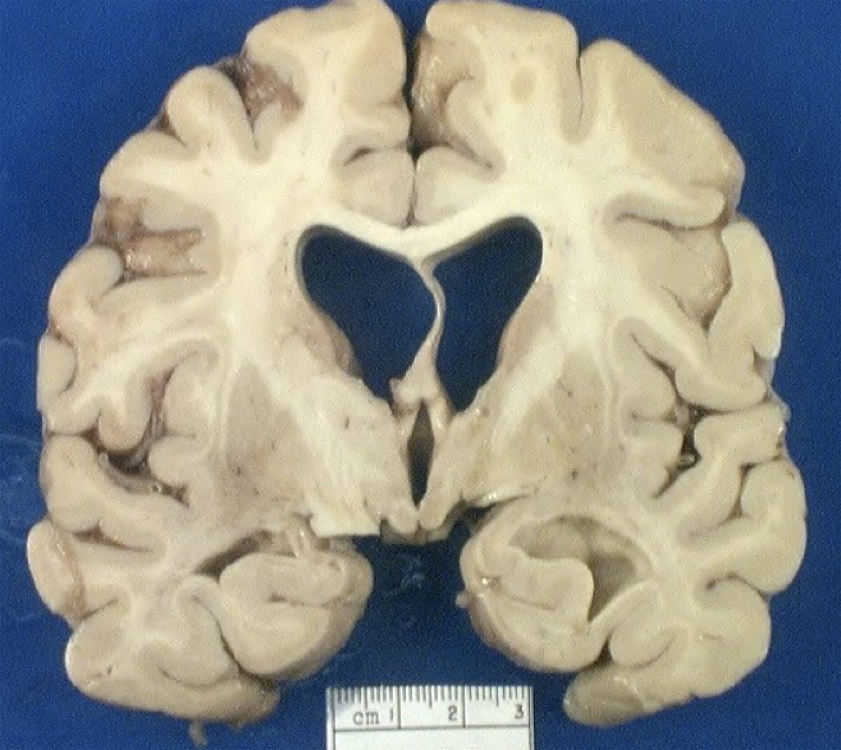 Alzheimer's Disease. Pathology shows amyloid neuritic plaque.