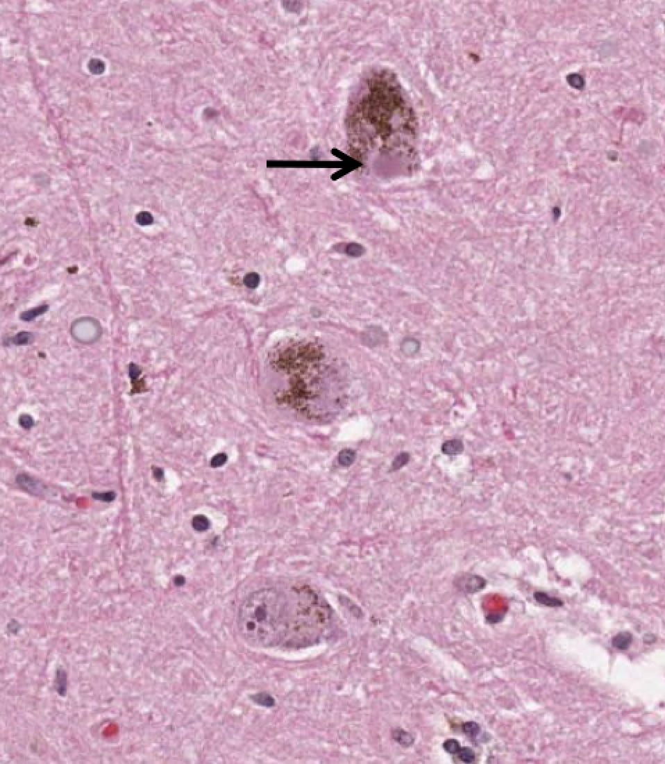 Lewy Body (alpha-synuclein inclusions), primarily seen in substantia nigra and locus coeruleus in Parkinson's Disease.