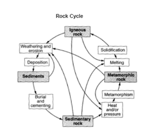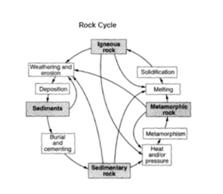 THE ROCK CYCLE IS A MODEL THAT DESCRIBES THE FORMATION, BREAKDOWN, AND REFORMATION OF A ROCK AS A RESULT OF SEDIMENTARY, IGNEOUS AND METAMORPHIC PROCESSES. (#55 on study guide)