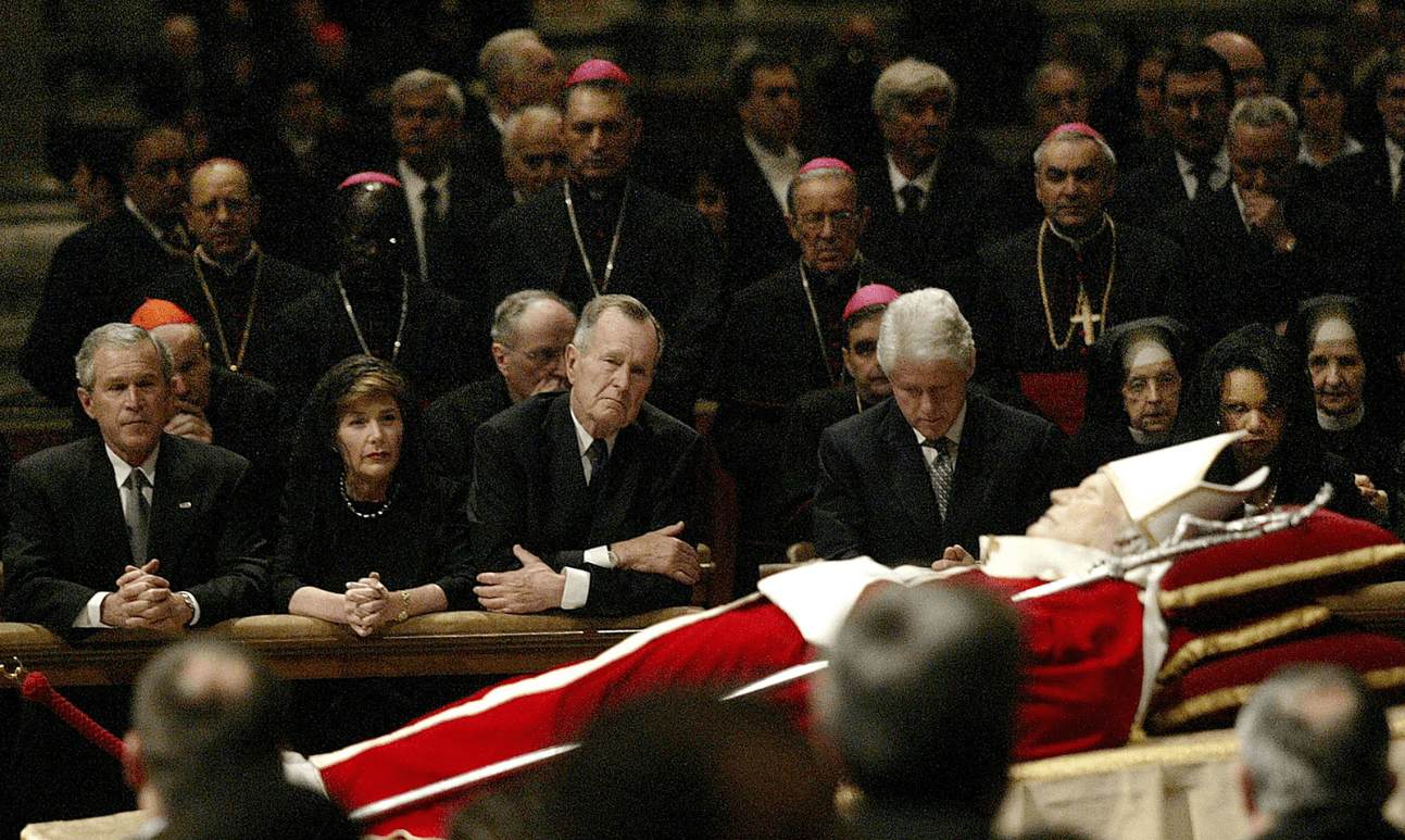 Seen here are former and current US Presidents (at the time) paying respects to this late pope that died in April of 2005 at the age of 84.