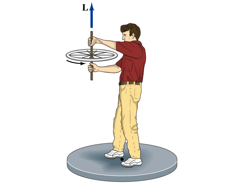 You are holding a spinning bicycle wheel (spinning counter clockwise) while standing on a stationary turntable. If you suddenly flip the wheel over so that it is spinning clockwise, the turntable will do what?