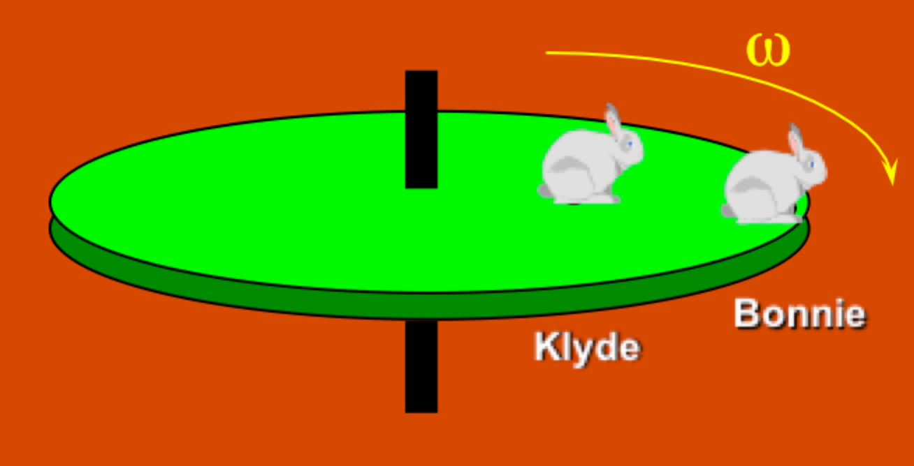 Bonnie sits on the outer rim of a merry-go-round, and Klyde sits midway between the center and the rim (at r/2). Bonnie has an angular velocity of 12 rad/s and tangential velocity of 10 m/s. Calculate Klyde’s rotational and linear velocity.