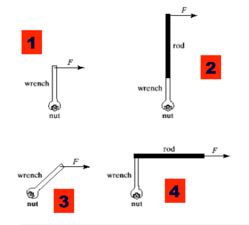 Rank the following from largest torque to smallest torque, assuming the force on each nut is the same. (Hint: two are tied)