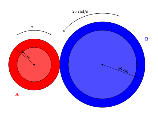 Calculate the rotational velocity needed on wheel A in order to make wheel B achieve a rotational velocity of 25 rad/s. Assume the radius of A is 30 cm and the radius of B is 50 cm.