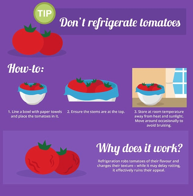 Food experts say that tomatoes should NOT be refrigerated. Cool temperatures diminishes flavour and texture.