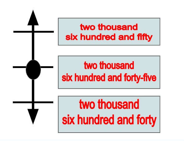 Round two thousand six hundred and forty-five to the nearest ten on a vertical number line. You must write ALL numbers in word form spelled correctly.