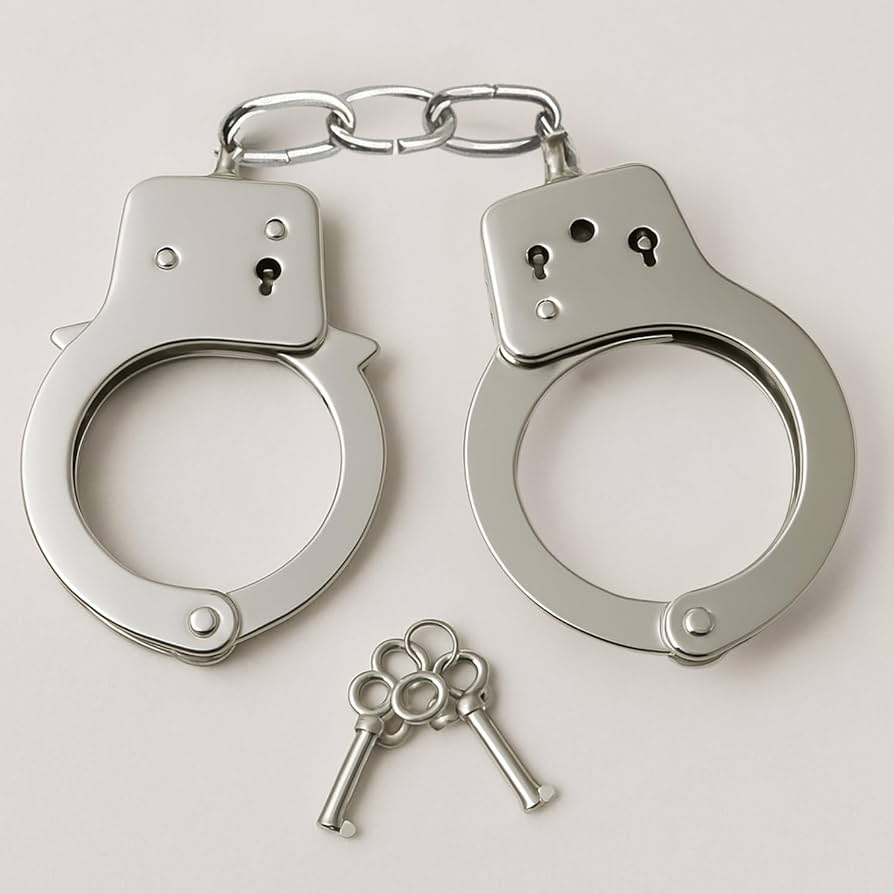 a pair of lockable linked metal rings for securing a prisoner's wrists.