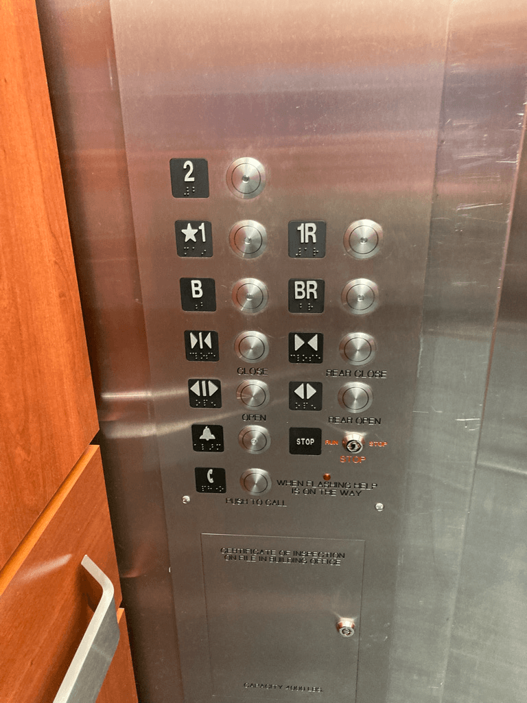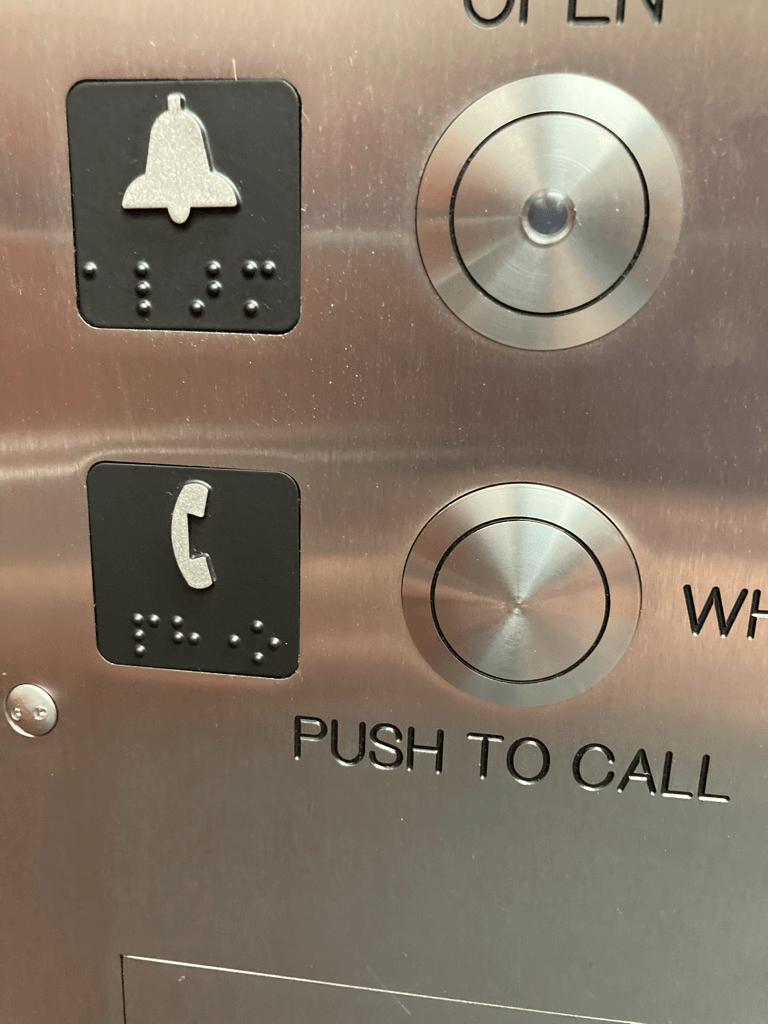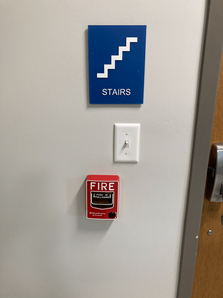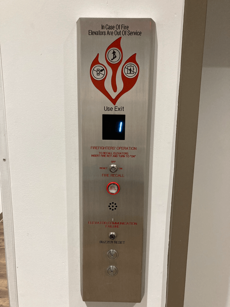 Does the top part of this sign tell you to use or NOT USE the elevator during a fire?