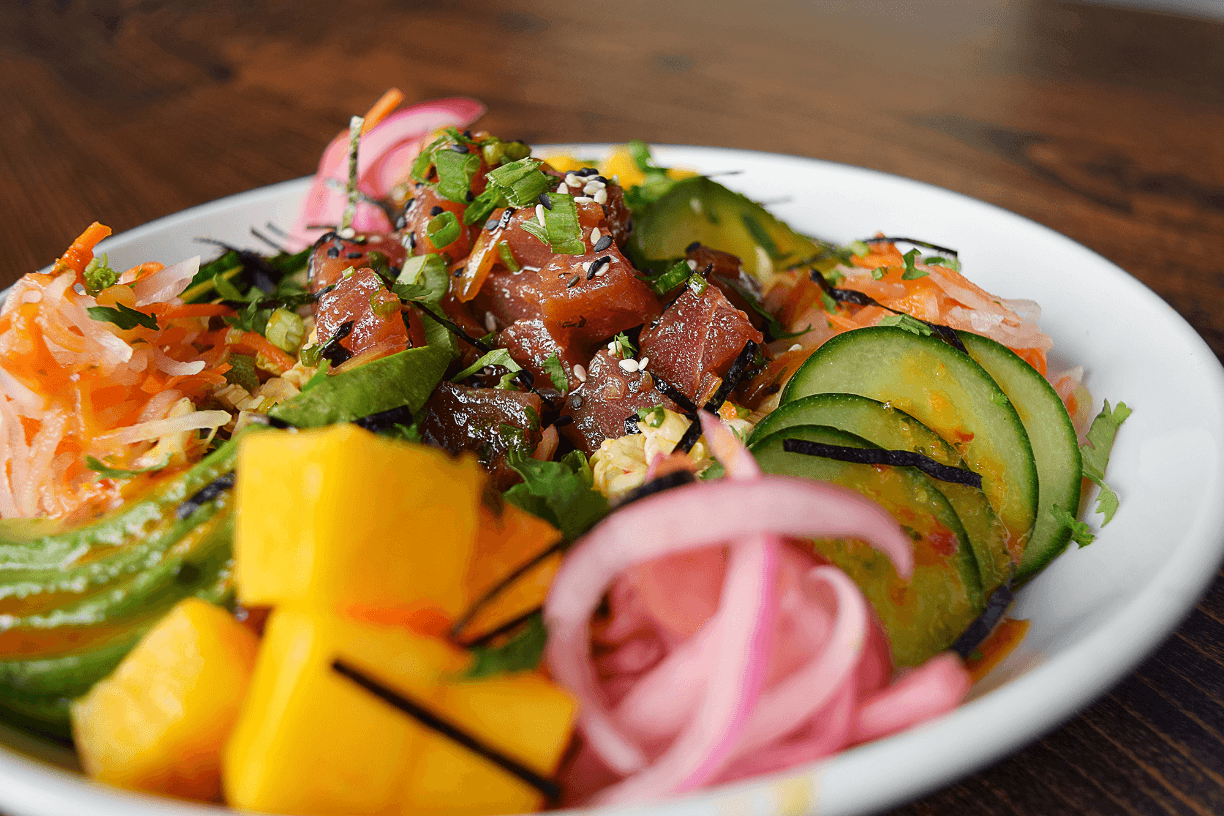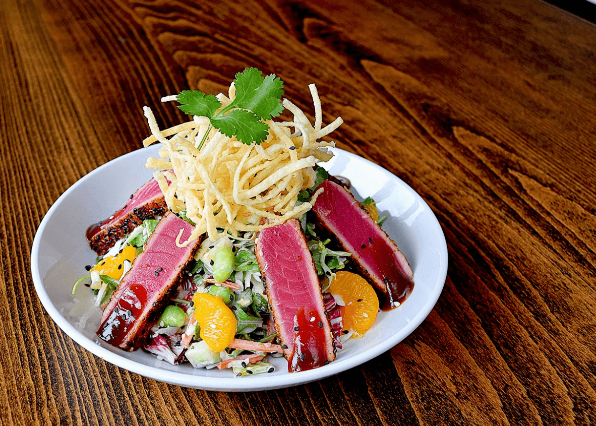 This dressing is tossed in the Seared Ahi Salad and it is unexpectedly NOT spicy.