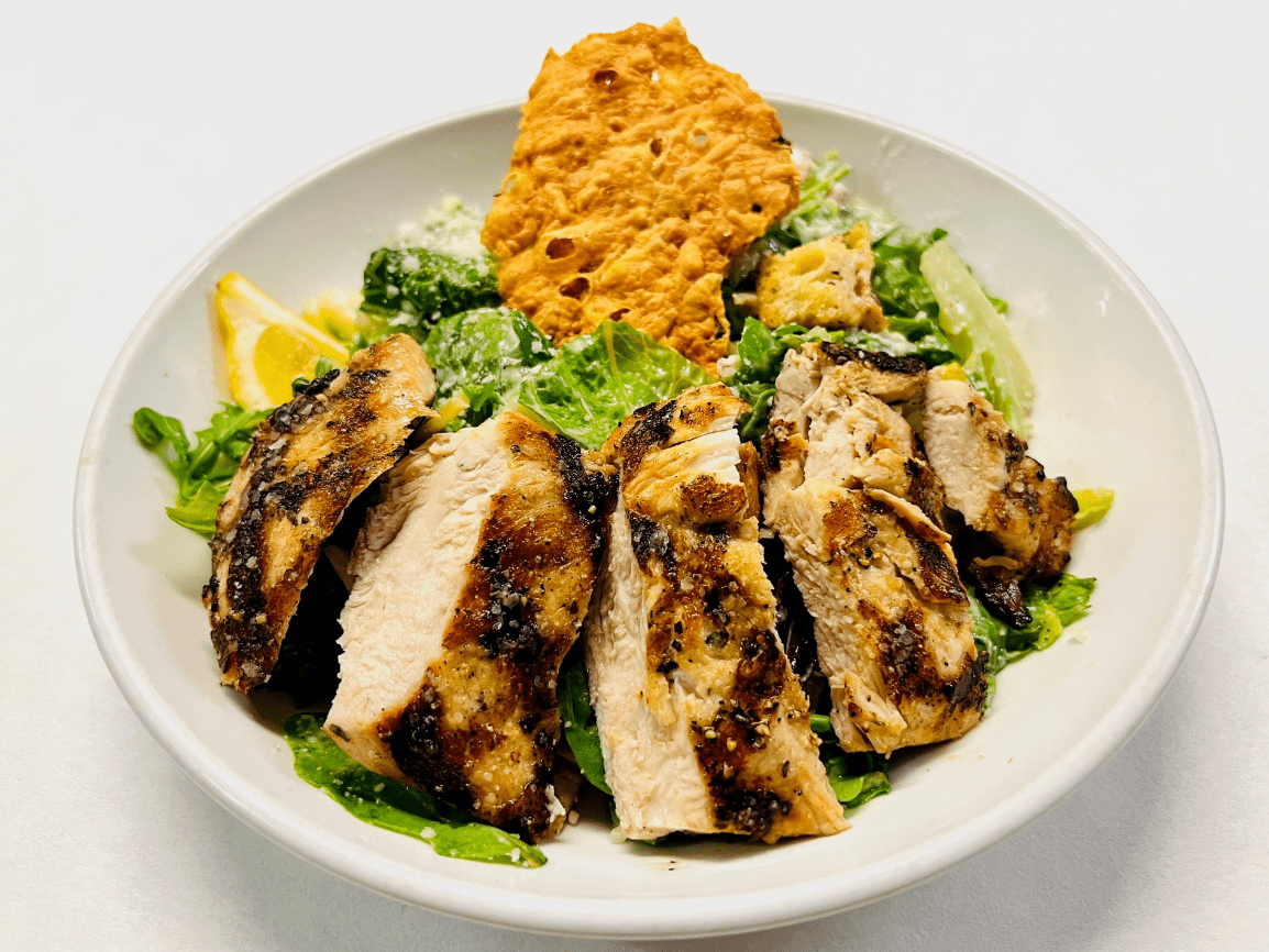 On our salads served with chilled sliced chicken how much does an upcharge for hot grilled chicken cost?