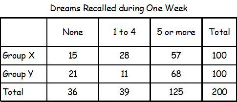 The data in the table above were produced by a sleep researcher studying the number of dreams people recall when asked to record their dreams for one week. Group X consisted of 100 people who observed early bedtimes, and Group Y consisted of 100 people who observed later bedtimes. If a person is chosen at random from those who recalled at least 1 dream, what is the probability that the person belonged to Group Y ?