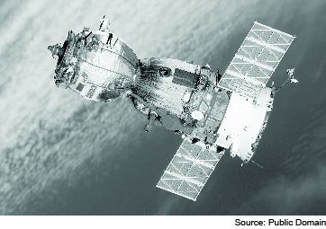The picture shows a satellite orbiting around Earth in space. The satellite contains a powerful telescope and cameras.