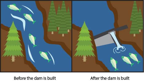 Based on the picture, what is good and what is bad about using hydro/water power?