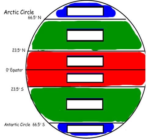1. Areas CLOSE to the equator get the MOST ENERGY and are WARMER