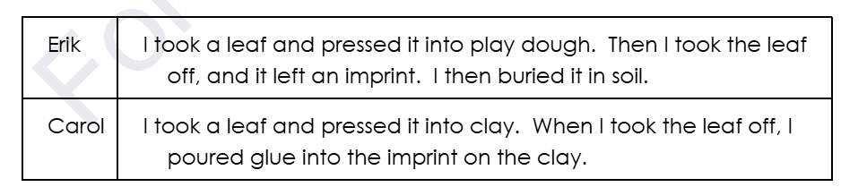 Erik and Carol are each creating a model to represent how an imprint of a leaf fossil is formed. Below are their descriptions of the model they created.