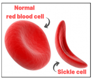 Sickle cell disease is caused by a mutation that produces an abnormal protein. The gene for sickle cell disease causes a person’s red blood cells to be shaped differently as seen in the image below. Sickle shaped red blood cells do not carry oxygen as well as normal red blood cells.