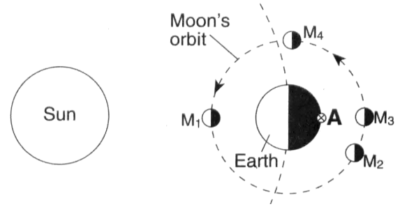 Which moon phase is visible from Earth when the Moon is located at position M1?