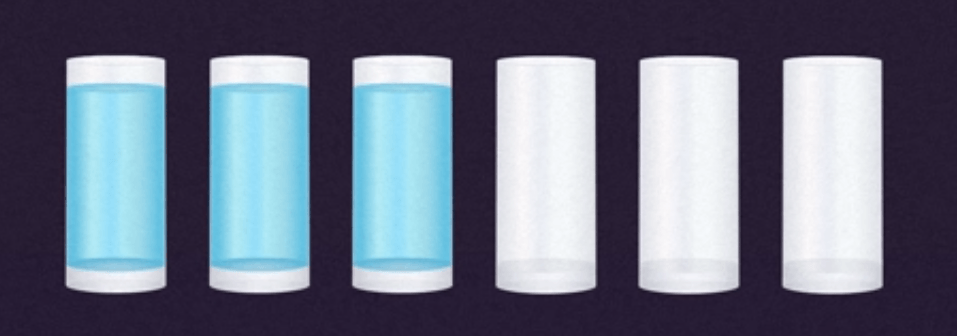 Hay seis vasos frente a ti, acomodados como se muestra en la imagen. Los primeros tres están llenos y los últimos tres están vacíos. Tocando sólo un vaso, como puedes hacerle para que estén acomodados: LLENO - VACÍO - LLENO - VACÍO - LLENO - VACÍO.