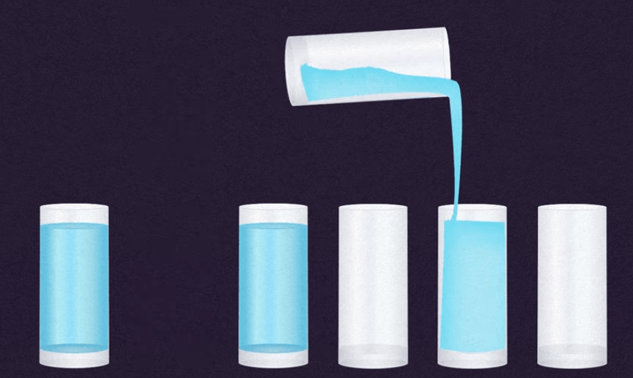 Sólo toca el segundo vaso y vierte el contenido en el quinto vaso. Solo tocas un vaso.
