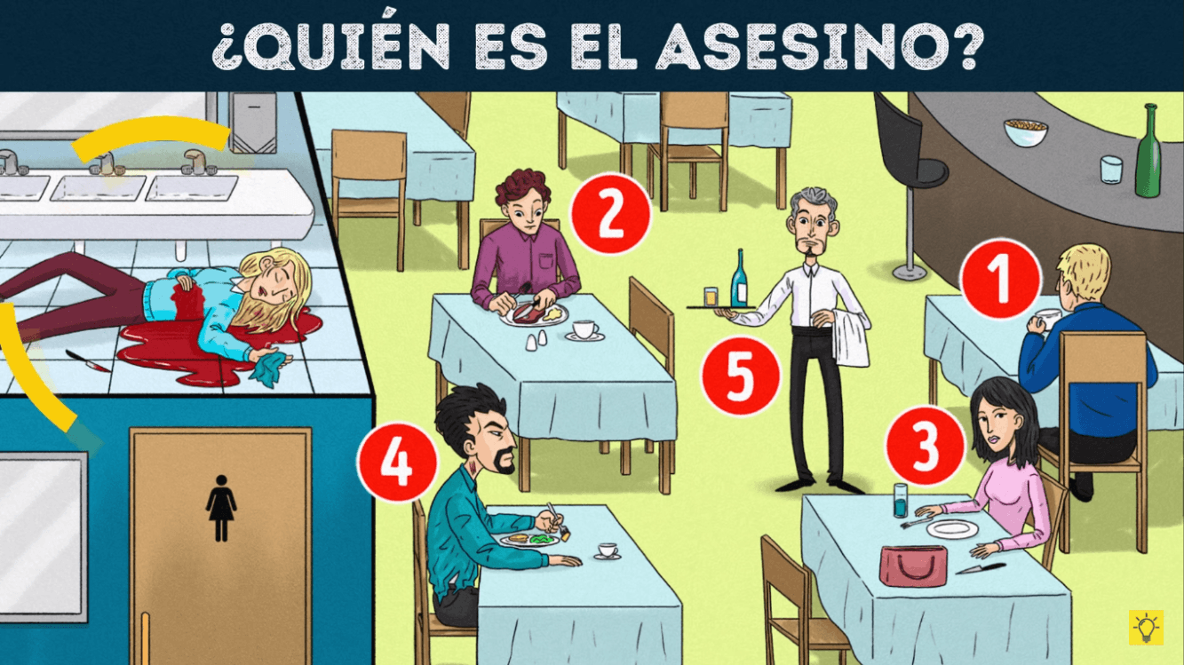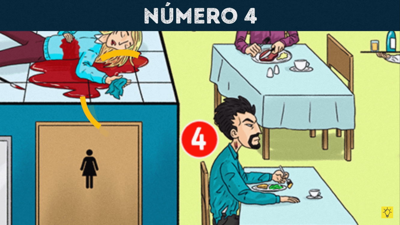 Una mujer fue asesinada en el baño de un restaurante, ¿puedes adivinar quien lo hizo con solo ver esta imagen? Menciona 3 pistas que te ayudaron a resolver el misterio.