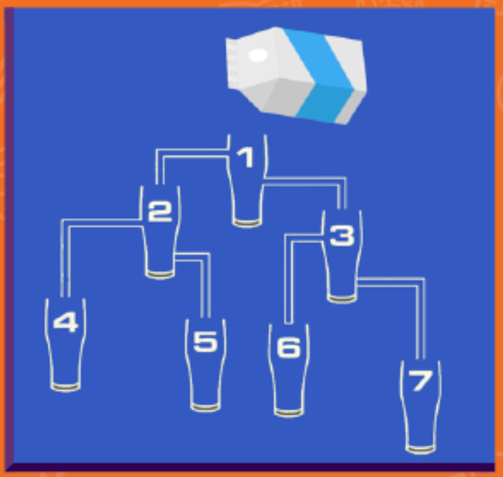 Glass 5, 6 and 7 not possible as there is a blocked connection. Now, as the connection to 3 is lower than that of 2, it will first while rest milk glasses will remain empty.