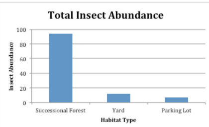 A significantly smaller number of insects live in the human created habitats of a yard and a parking lot compared to the natural forest habitat.