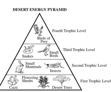 What best explains the difference in the amount of available energy in the trophic levels of a desert ecosystem?