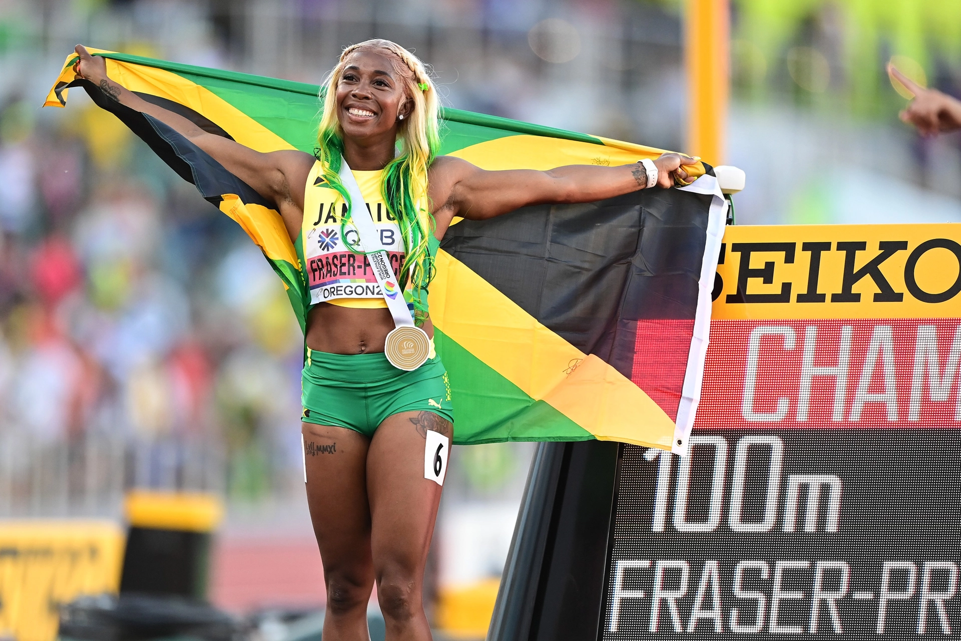 The first Caribbean woman to win a gold medal in the 100-meter sprint at the Olympic Games