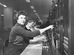 d) “Hold the line” - Telephone operators manually connected calls, asking callers to stay on the line during the process.