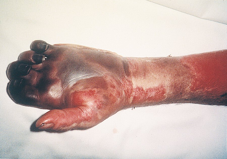 On physical examination, vital signs are normal. A few tiny puncture wounds with minimal erythema are noted over the dorsum of the left hand.