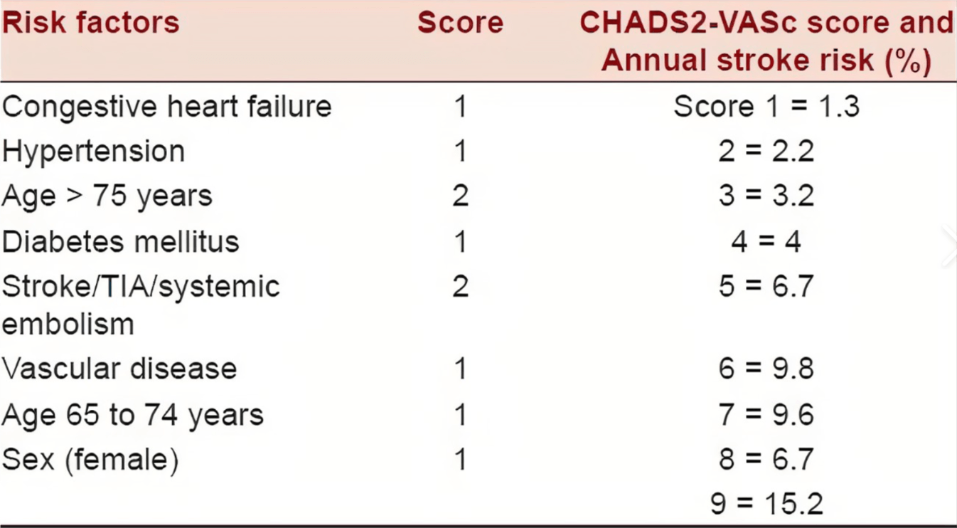 Patient is a 64yo F with PMH of TIA, HTN and DM. LVEF is 50%. She is diagnosed with AF and has this CHADS-VASc score.