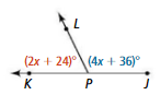angleKPL and angleJPL are linear pairs. Find the measure of both angles.