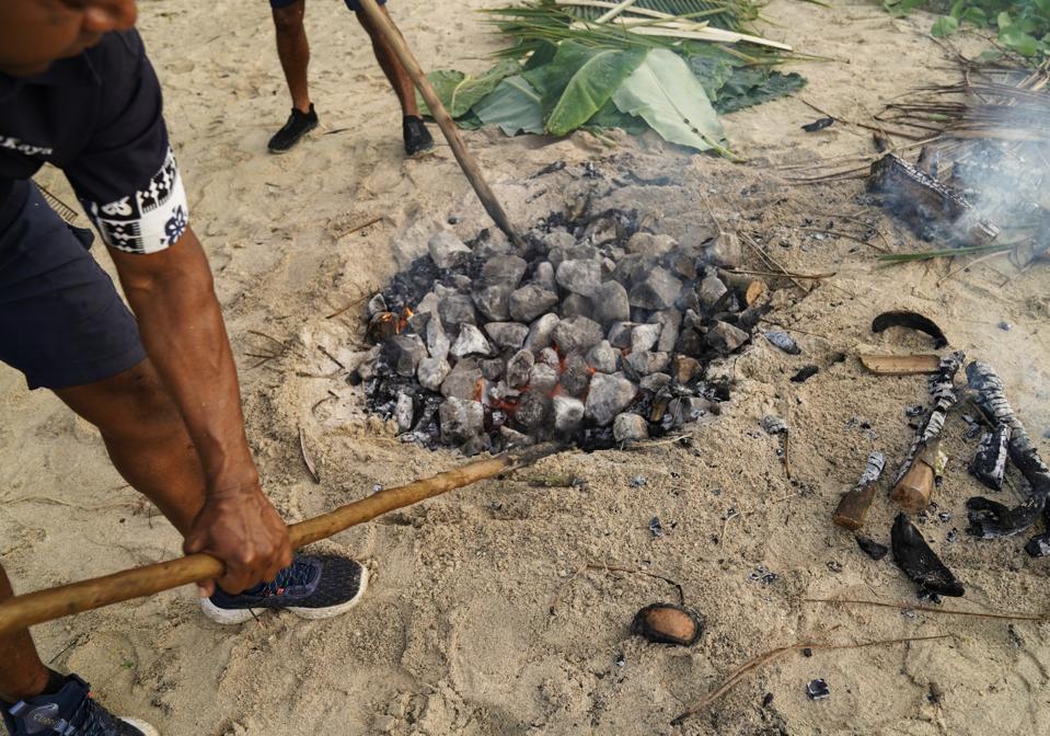 Fijian style barbeque. Meat and vegetables are wrapped in banana leaves and cooked in a hole in the ground.