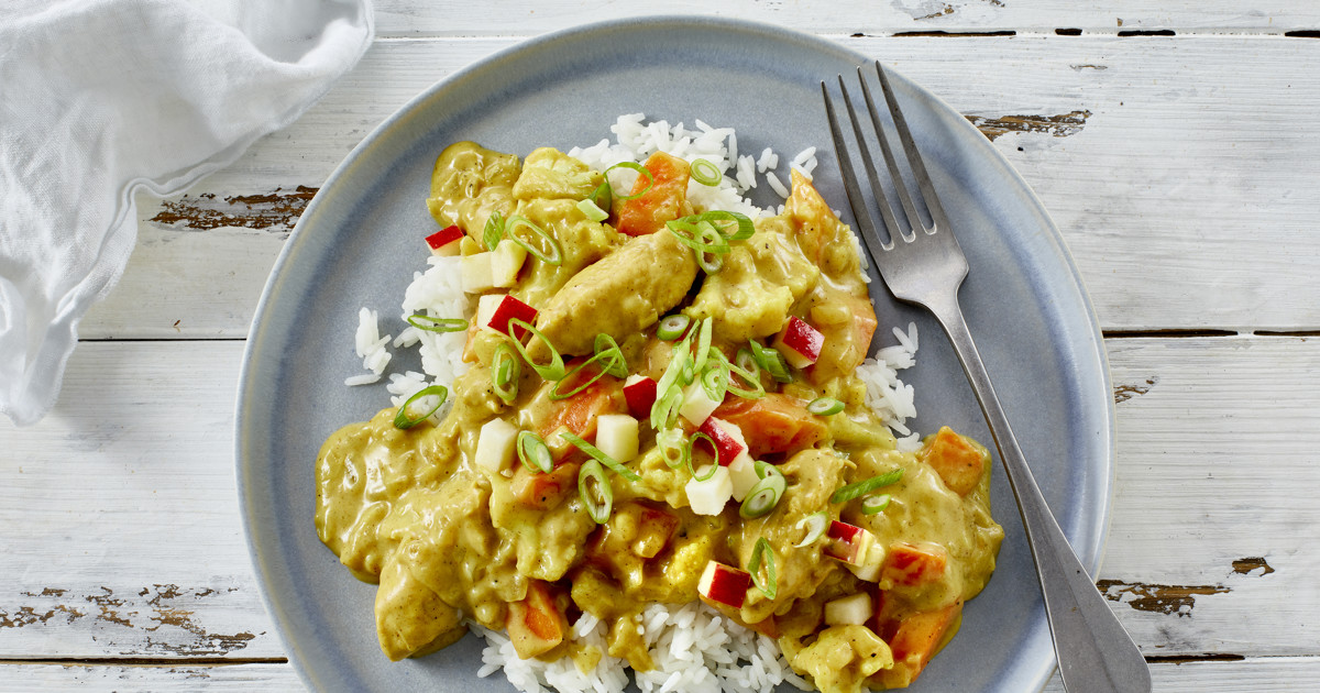 hvad er: kylling, ris, karry, løg, hvedemel, græntsagsbouillon, smør, mælk/kokos mælk, salt og peber.