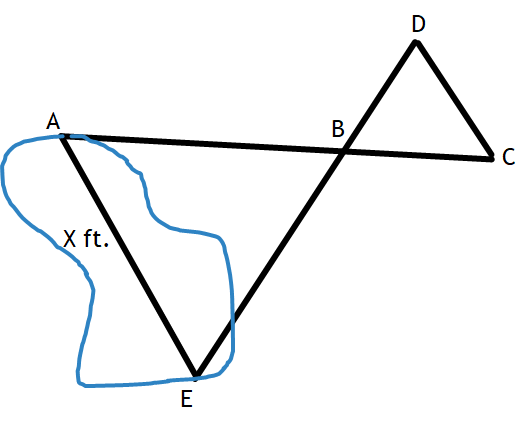 A summer camp counselor wants to find a length, x, in ft. across a lake represented in the picture below. The lengths represented by AB, EB, BD, and CD on the sketch were determined to be 1800 ft, 1400 ft, 700 ft, and 800 ft respectively. Segments AC and DE intersect at B, and <AEB and <CDB have the same measure. Use a proportion to determine the value of x.