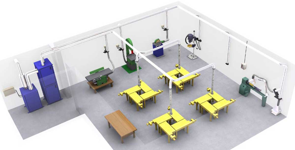 Spånet sugs upp i rören i taket. Sedan åker det ner i en stor säck som finns i det röda skåpet i virkesförrådet.